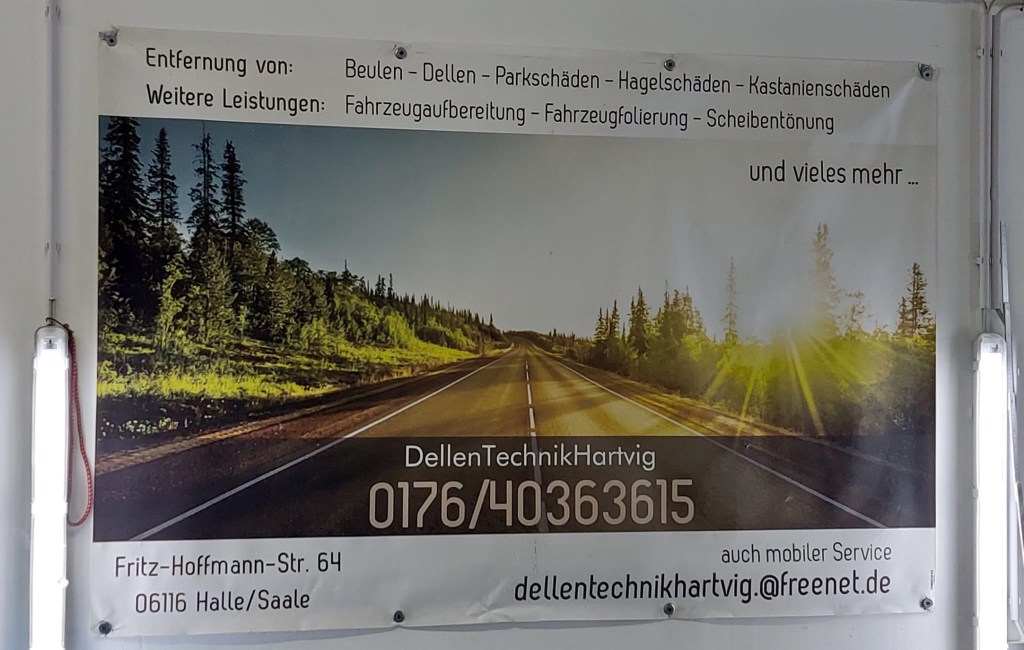 DellenTechnikHartvig wer bin ich und wo komm ich her? Ich habe seit 2020 meine eigene Garage in der Fritz-Hoffmann-Straße 64 Halle(Saale). Ich bin sehr erfahren und bekomme fast jede Delle lackierfrei raus, außer es besteht ein Lackschaden. Außerdem biete ich viele andere Dienstleistungen wie Scheibentönung, Teil Folierung, Fahrzeugaufbereitung und Lederpflege an. Ich freue mich auf Ihren Besuch!